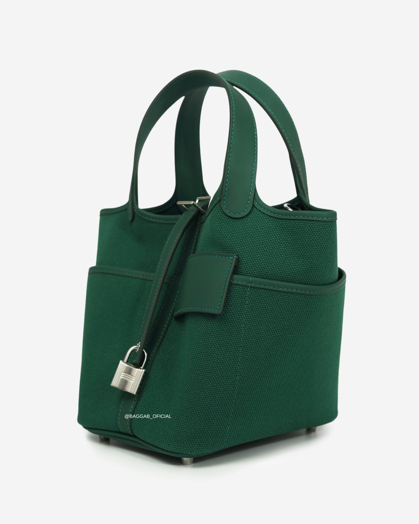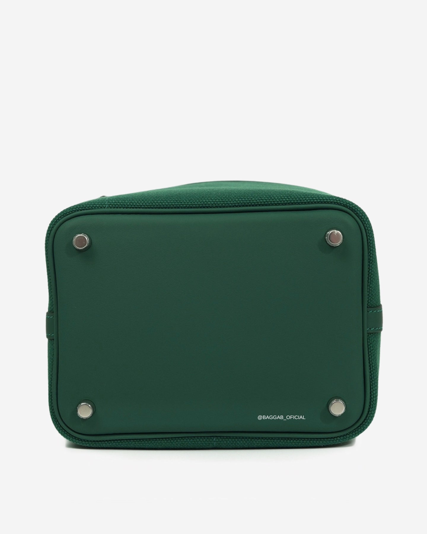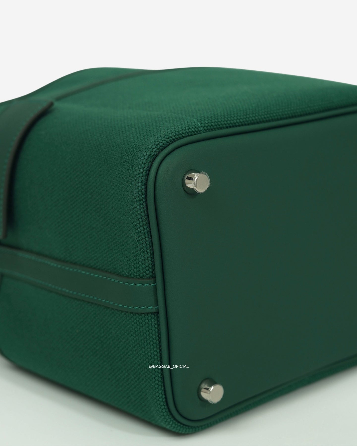 Hermès Picotin 18 confeccionada à mão em 2023 (selo “B”), em tecido Toile Goeland e couro Swift na cor Vert Moyen, um tom de verde intermediário presente há décadas na paleta Hermès.