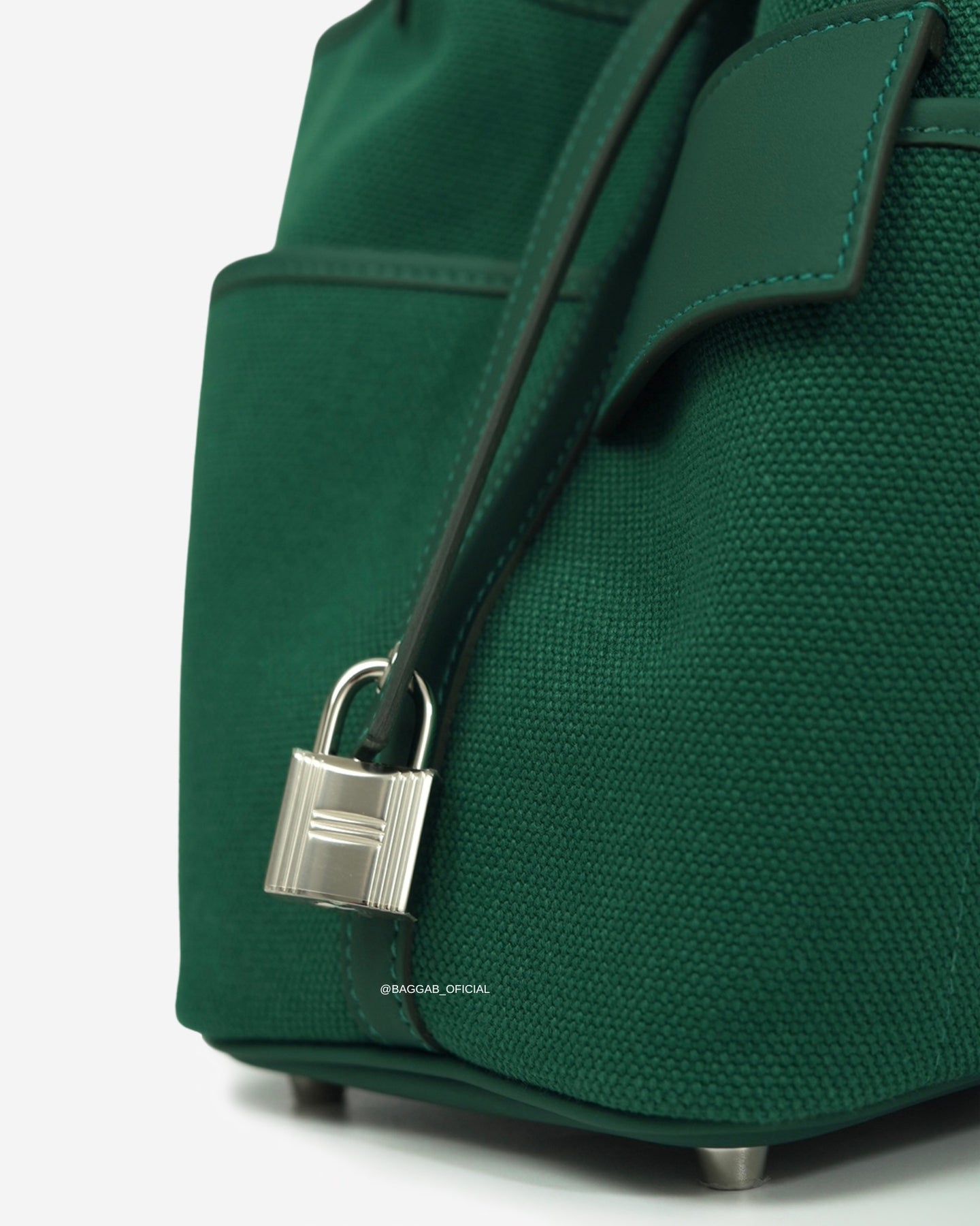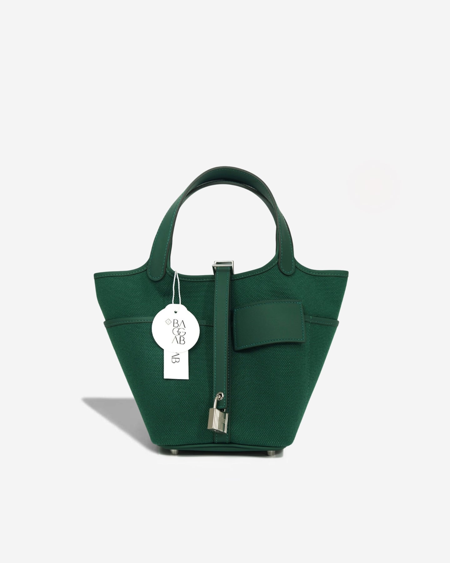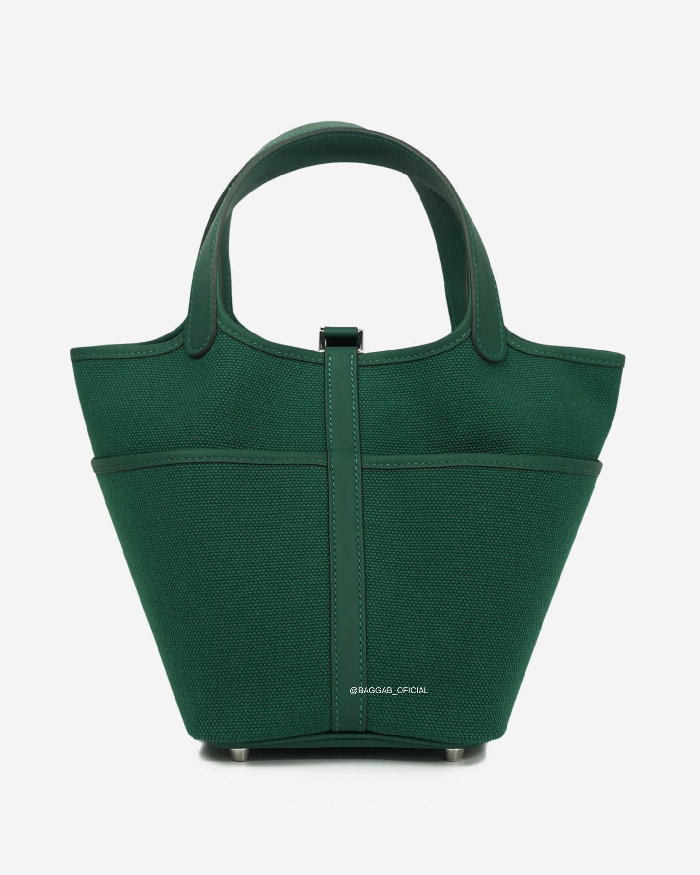 Hermès Picotin 18 confeccionada à mão em 2023 (selo “B”), em tecido Toile Goeland e couro Swift na cor Vert Moyen, um tom de verde intermediário presente há décadas na paleta Hermès.