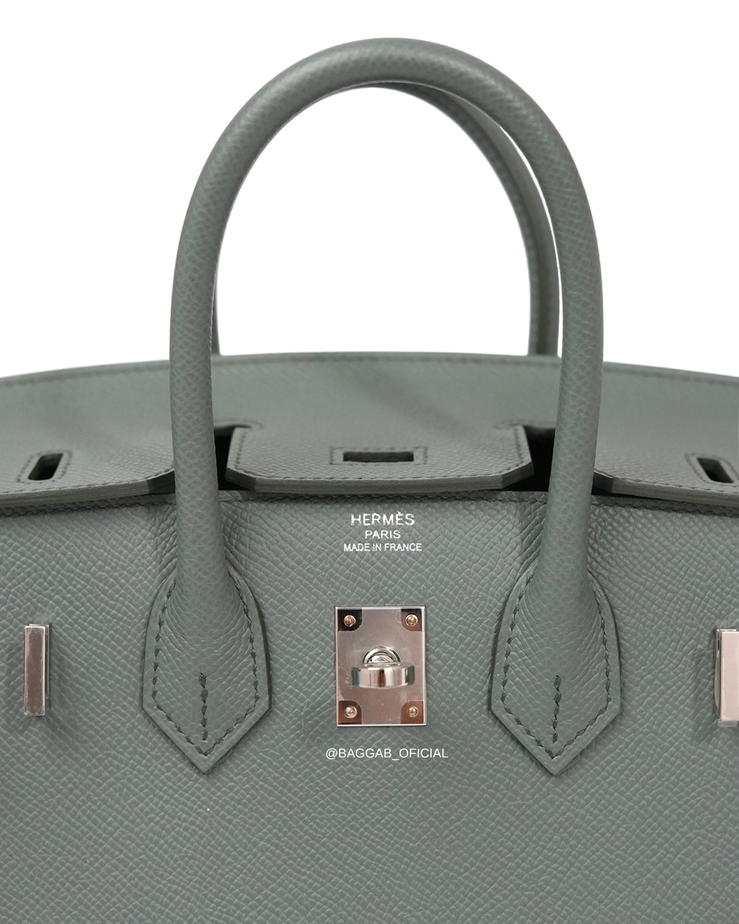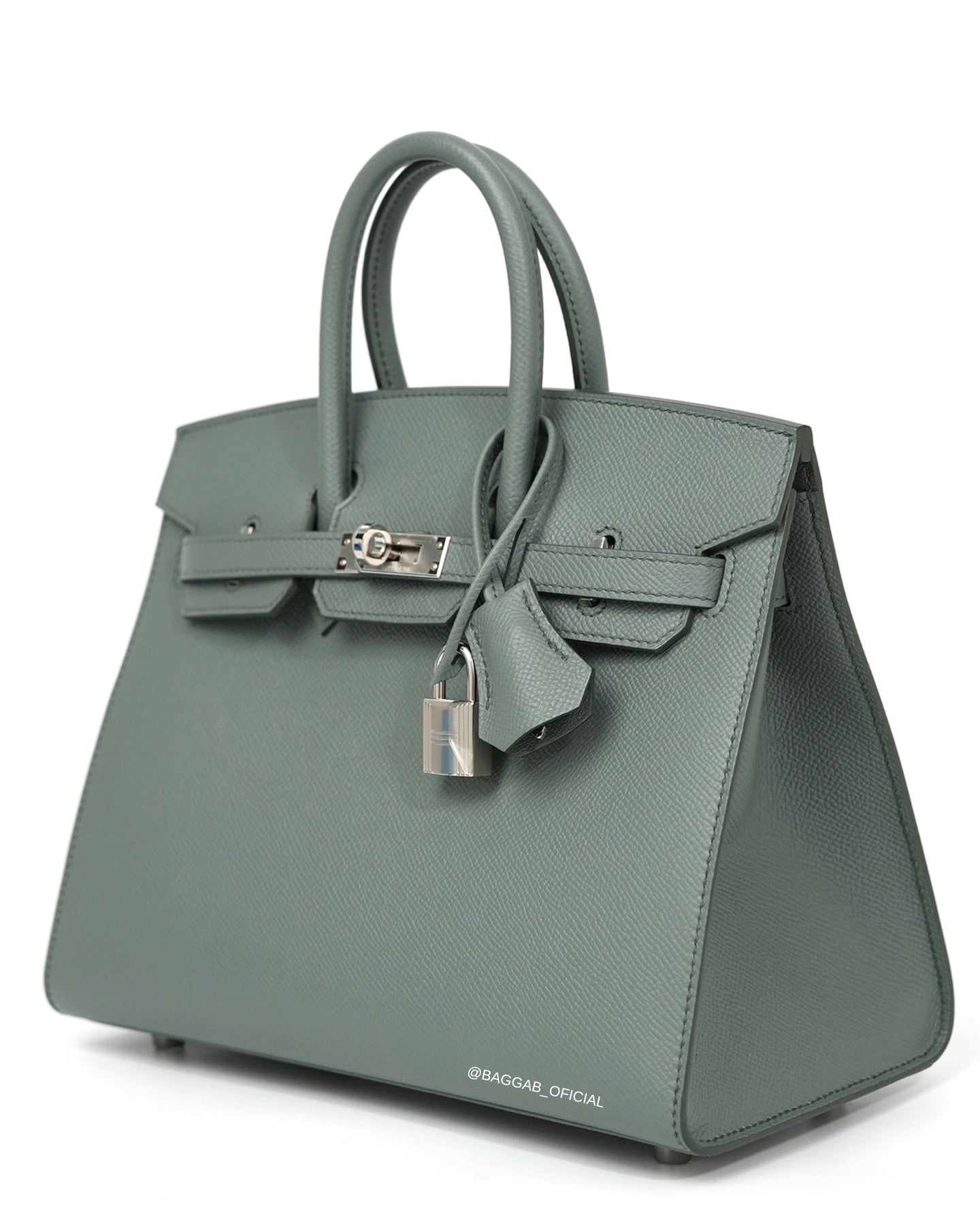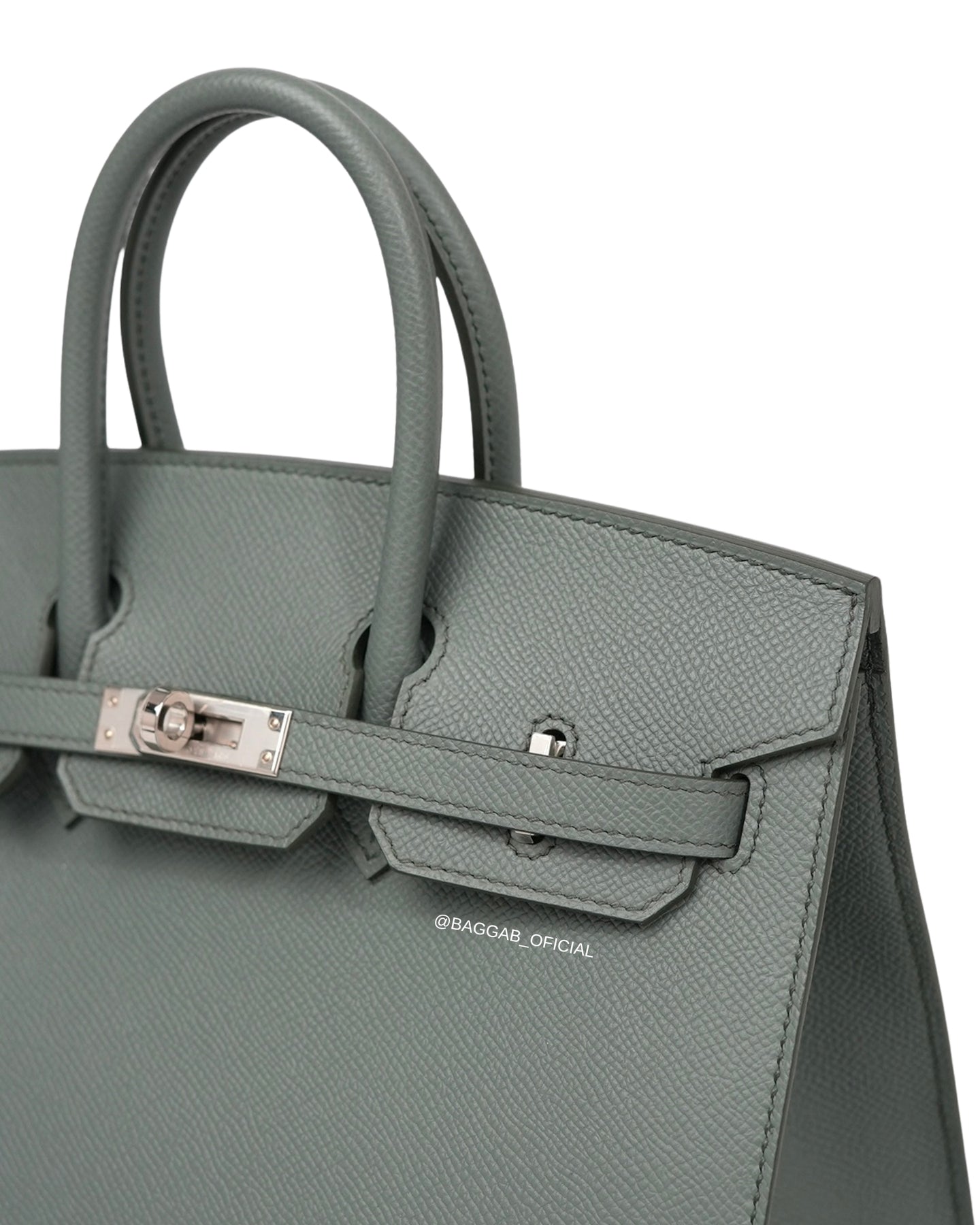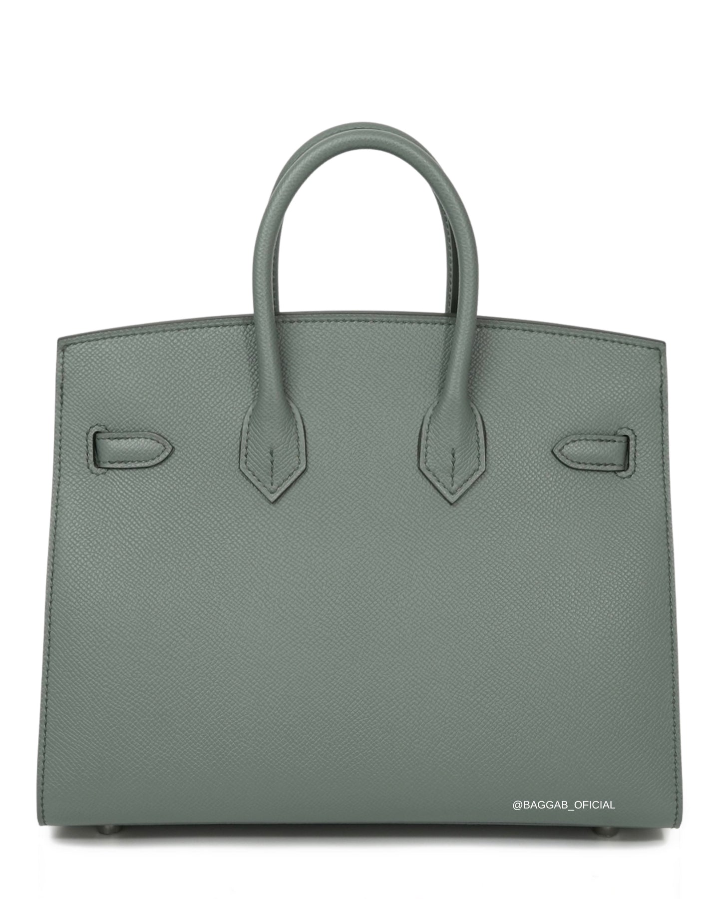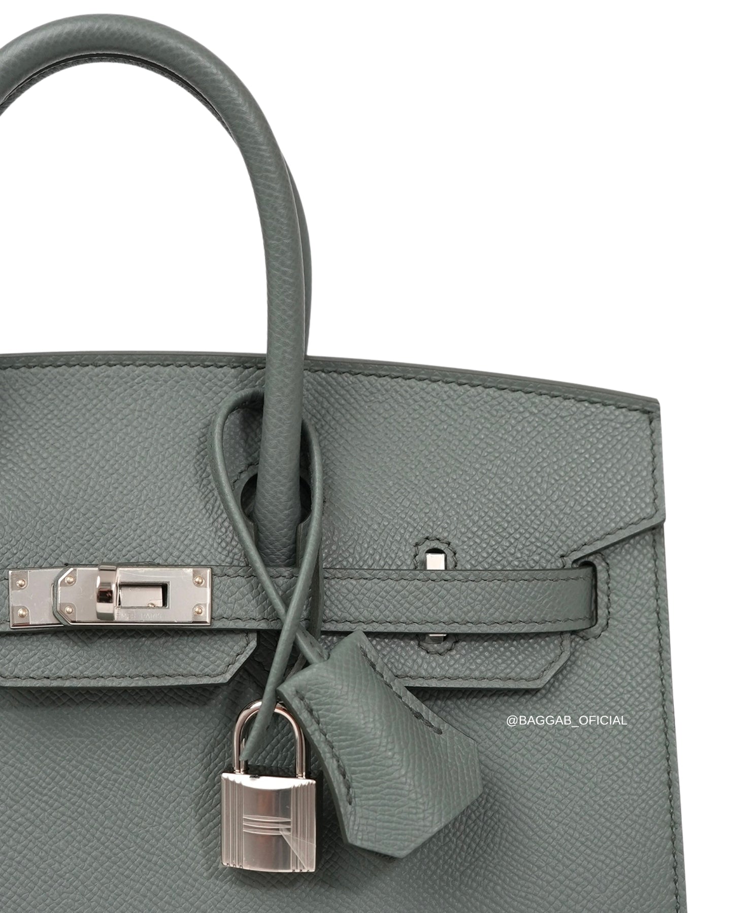 Hermès Birkin 25 Sellier confeccionada a mão nós ateliês da Hermès em 2025 (Stamp “K”) em couro Epsom na cor Verr Amande, um tom de cinza intermediário, suave, versátil e elegante, introduzida a biblioteca de cores da Hermès na coleção de Outono de 2019. Com significado “Verde Amêndoa”, faz referência a cor da casca de amêndoa fresca.