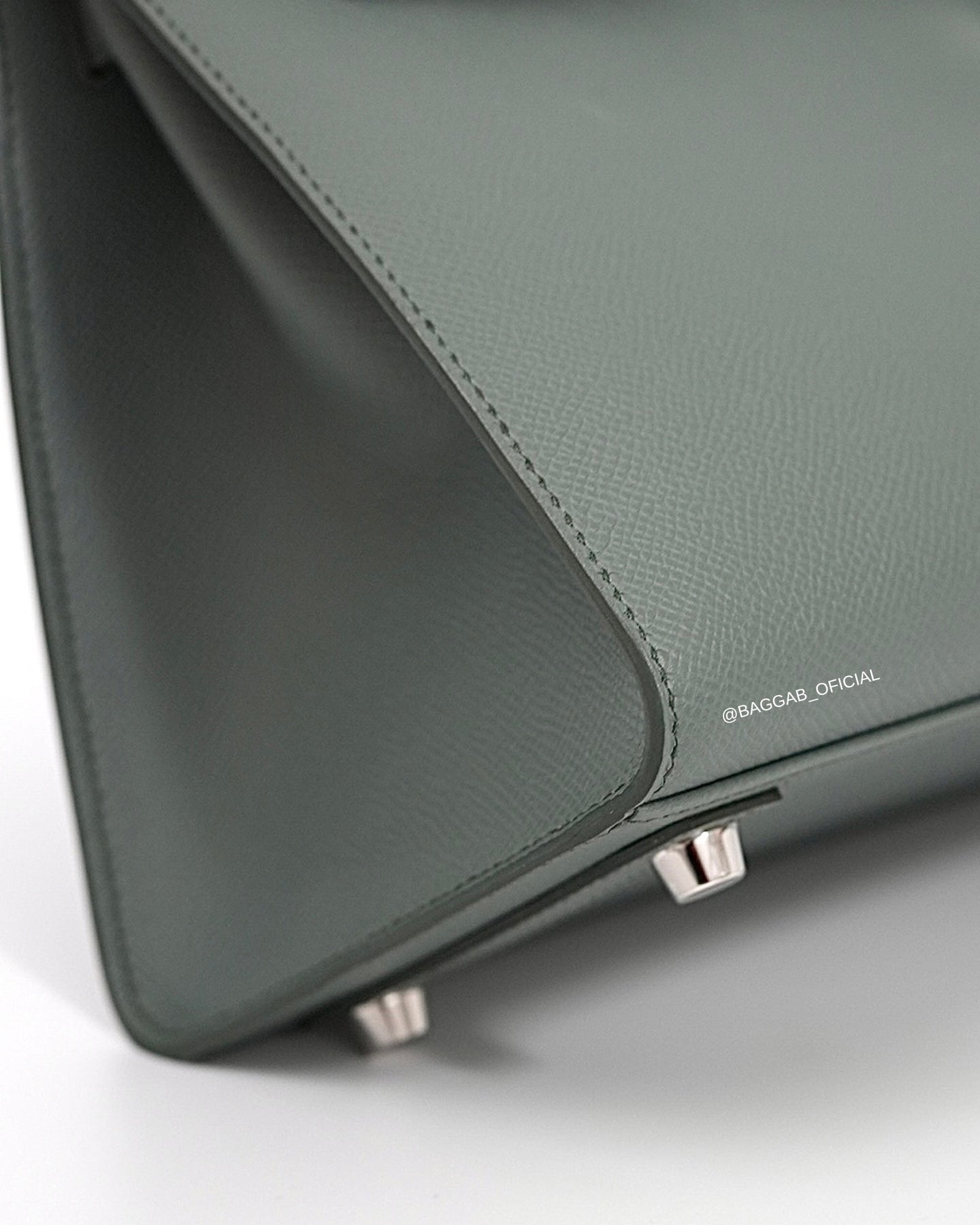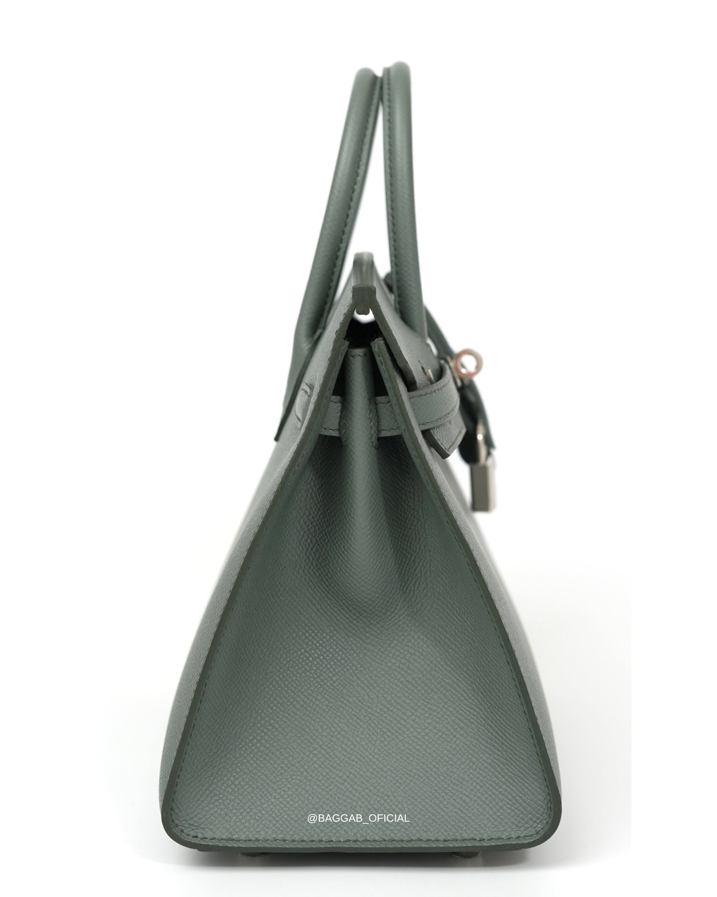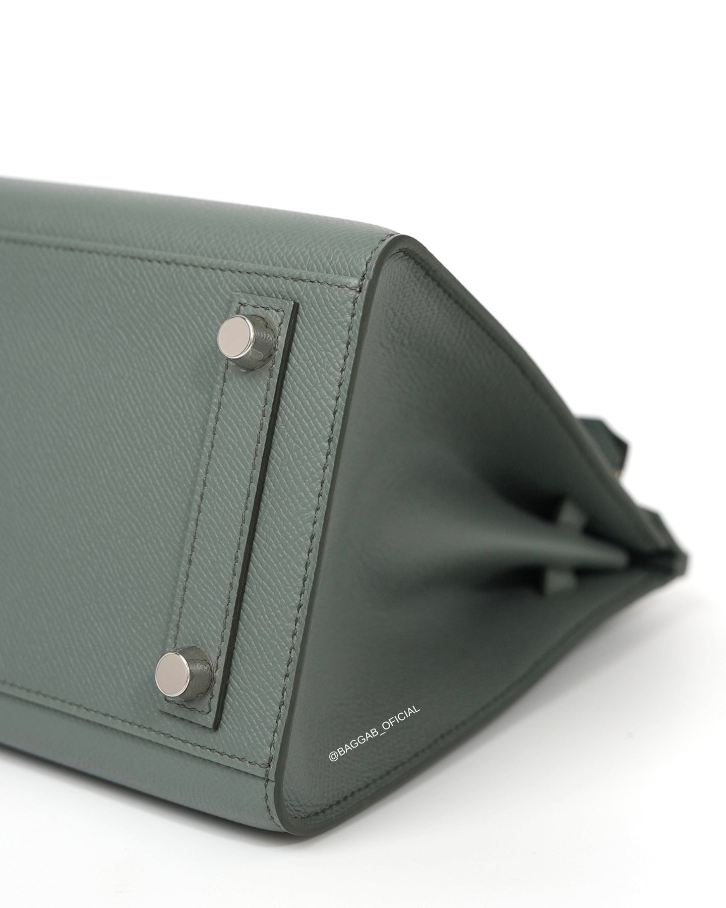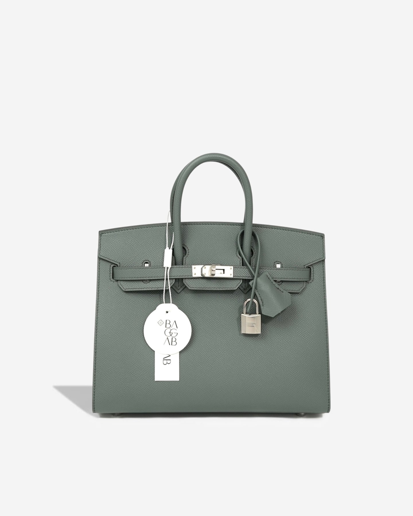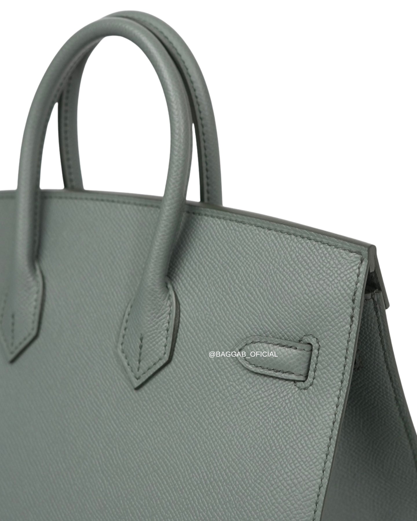 Hermès Birkin 25 Sellier confeccionada a mão nós ateliês da Hermès em 2025 (Stamp “K”) em couro Epsom na cor Verr Amande, um tom de cinza intermediário, suave, versátil e elegante, introduzida a biblioteca de cores da Hermès na coleção de Outono de 2019. Com significado “Verde Amêndoa”, faz referência a cor da casca de amêndoa fresca.